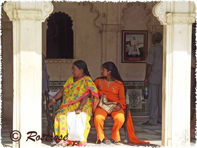 Auch die Inderinnen, die im Palast die Kunstschätze besichtigen und zwischendurch im Patio ein ruhiges Schattenplätzchen suchen, um ein wenig zu rasten, verbreiten in ihren prächtig-bunten Gewändern eine märchenhafte Aura. / The Indian women who are visiting art treasures in the palace and seeking a quiet shady place in the patio to rest a little, are also spreading a magical aura with their gorgeous, colorful costumes.