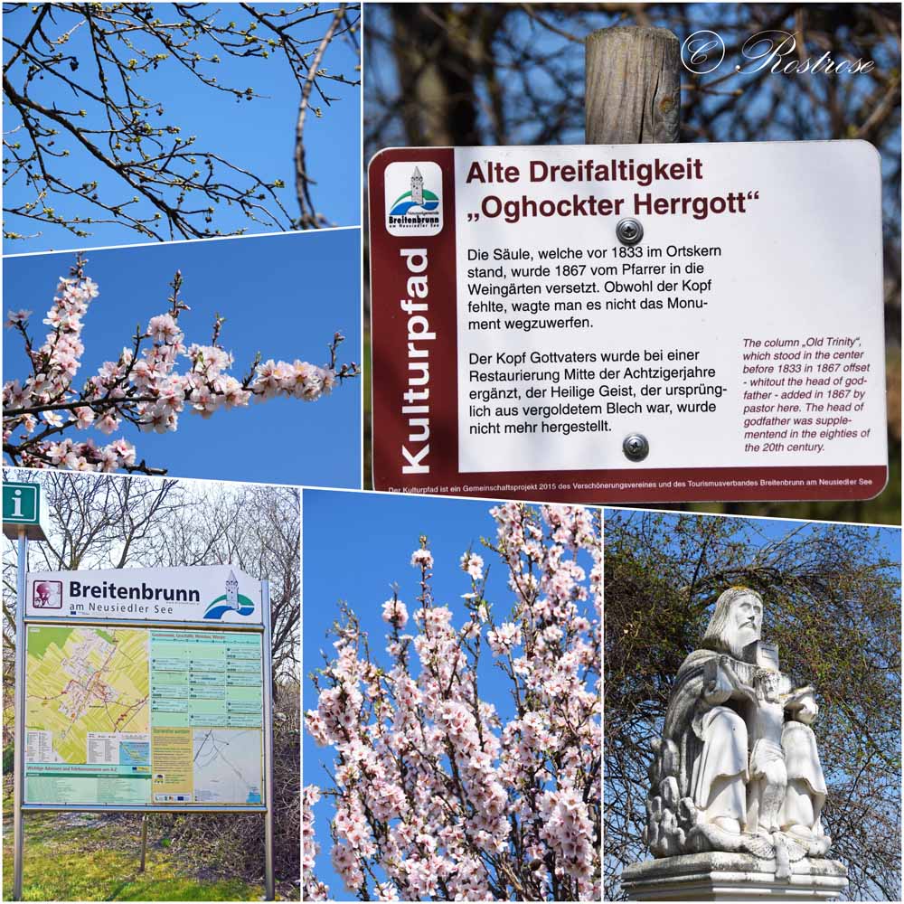 (siehe nächste Collage unten links). Es finden sich in Pillichsdorf auch mehrere Bänke, wo man sich niederlassen kann, um ein genussvolles Achterl zu trinken.