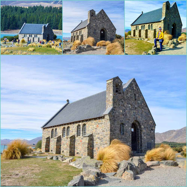 Außerdem gab es dort das "meistfotografierte Gebäude Neuseelands": die Kirche zum Guten Hirten (siehe unten rechts und darauf folgende Collage).